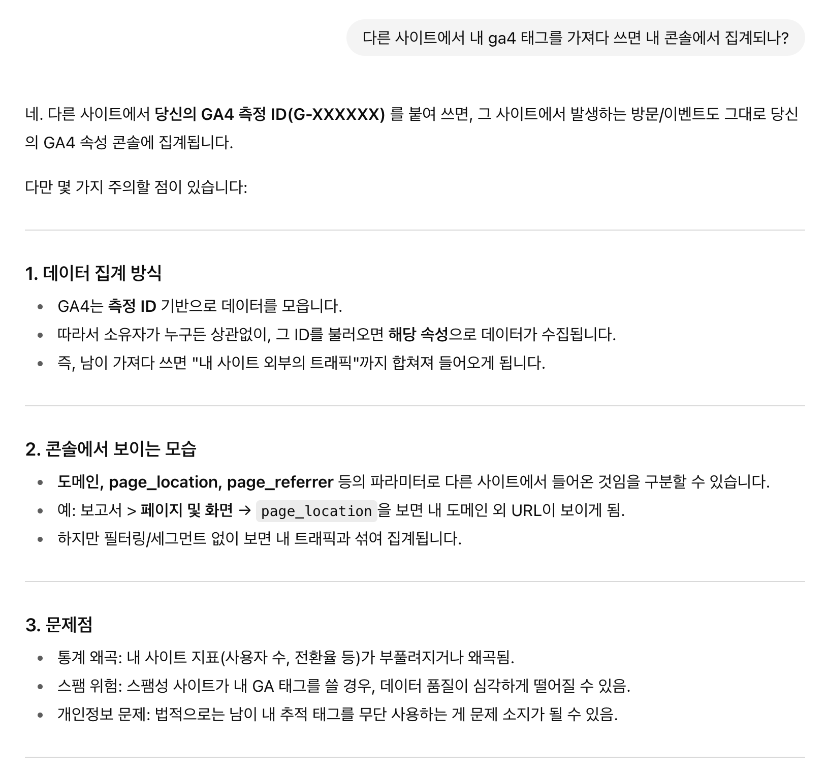 • 스팸 위험: 스팸성 사이트가 내 GA 태그를 쓸 경우, 데이터 품질이 심각하게 떨어질 수 있음.