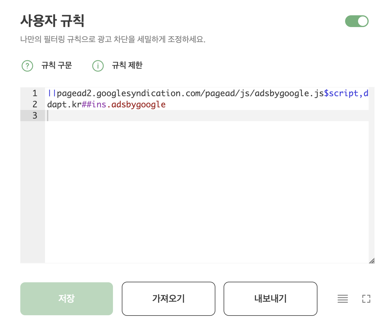 → 그래서 직접 필터 규칙을 추가해서 adsbygoogle.js 같은 걸 차단할 수가 없어요.
