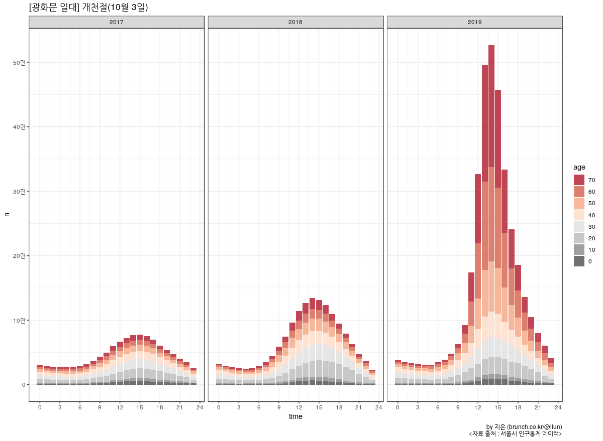 전년도와 그래프 모양이 확연히 다른 건 광화문 데이터와 비슷하지만, 왠지 빨간색(장년층)이 눈에 덜 띄는 것 같기도.