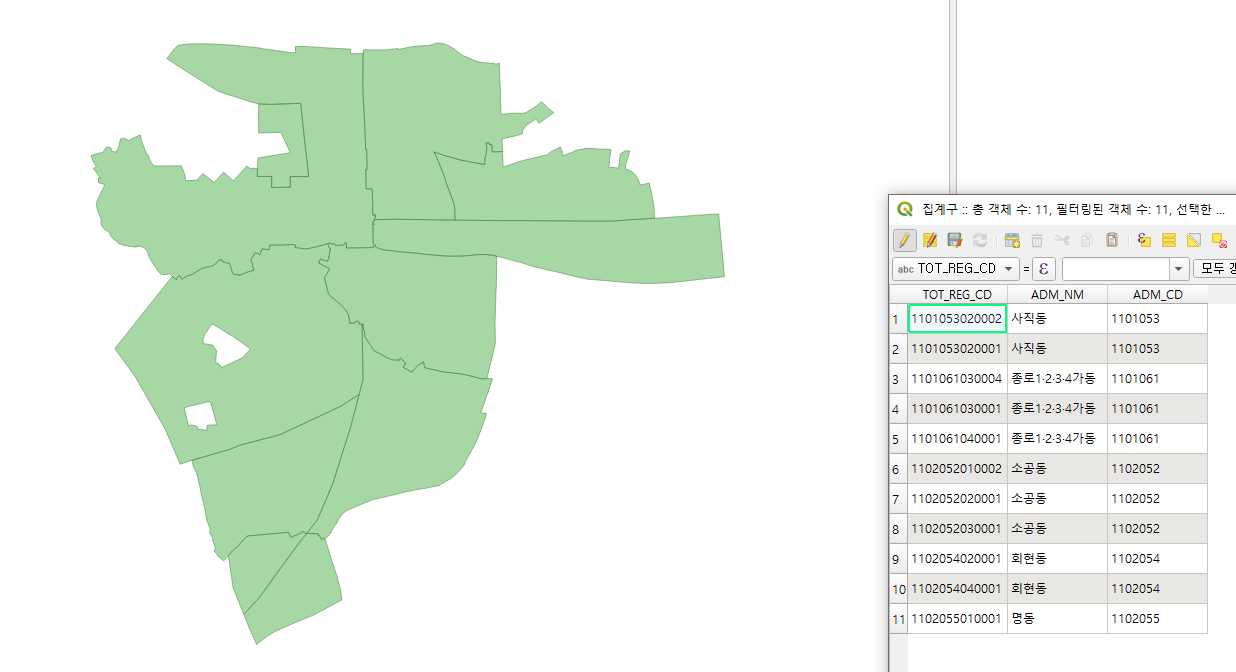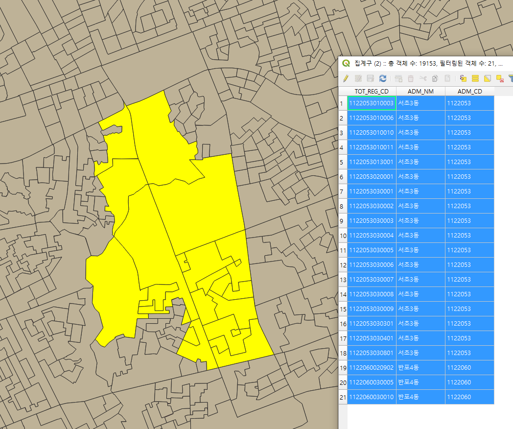 집계구는 뉴스에서 자세한 설명이 없었는데, 다른 기사에 그림이 있어 똑같이 설정했다. shp파일을 열어보겠다고 GIS 프로그램도 처음 접해가면서 광화문 11개, 서초 21개의 코드를 확인했다. 기사 본문에는 24개를 확인했다고 하는데, 캡쳐시점 이후 분석과정에서 달라진 듯하다. 실제 지도와 겹쳐서 확인해봤으나 임의로 3개를 추가하는 게 적절치 않아 보여서 21개만 이용했다. 행정동보다 세분화된 집계구 코드가 궁금하다면 아래 캡쳐를 참고 바란다.