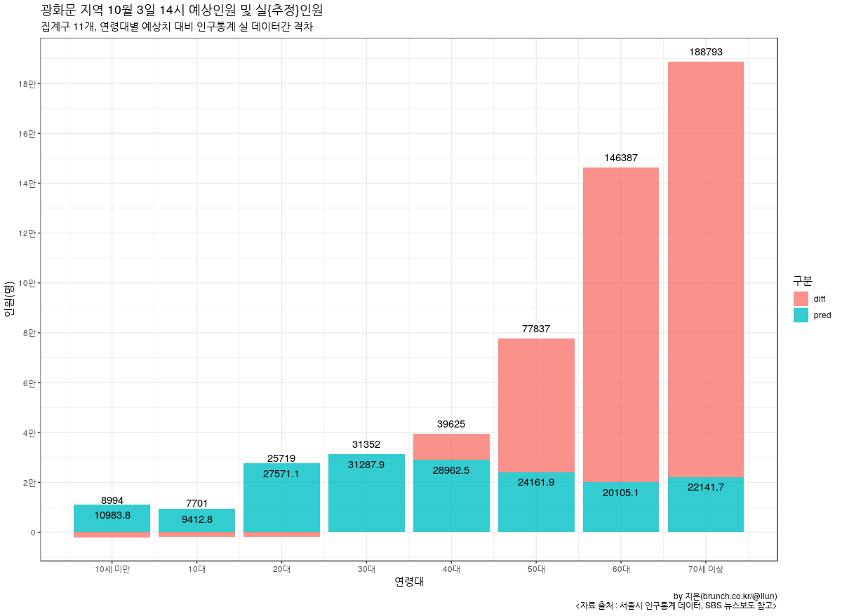 이제 결론에 거의 다다랐다. 예측이라고 했지만 사실 우린 이미 답을 알고 있다. 그 예측치와 실제 인원과의 차이가 (아마도) 집회와 관련된 증감 인구라고 할 수 있을 것이다. 아래 차트에서 빨간색이 평소와 다른 행동 패턴을 보인 인구다. 20대까지는 여느 때와 비슷한 인원이 인구통계 데이터로 집계됐고, 30대부터 70대까지, 연령이 올라갈수록 급증하는 모습이다.