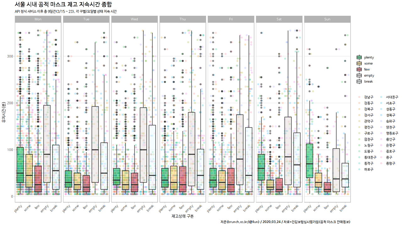 • 우선 서울 시내로 한정하여 요일별로 구분하고 마스크 재고의 각 상태가 지속되는 시간을 흩뿌려 놓았습니다.