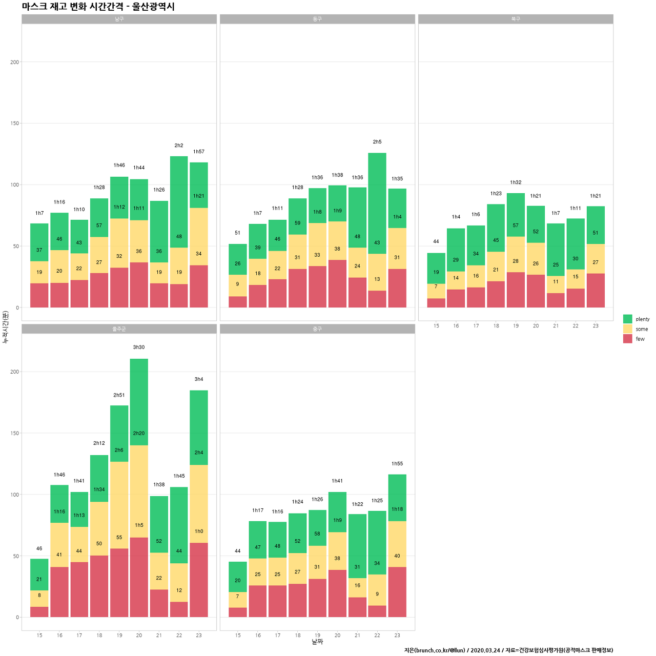 상위 1,2위를 차지한 전라북도와 대구광역시 그리고 가장 빨리 상태가 변한(조기 소진된) 울산광역시도 동일한 방법으로 그려봤습니다. (지역별 편차가 큰 이유는 판매 속도 차이뿐만 아니라 판매 방식에 따른 차이일 수도 있습니다. 가령 번호표를 나눠준다든지 시스템에 입력을 몰아서 한꺼번에 한다든지 등등. 그에 따른 지역간 차이는 없다고 가정하고 평균값을 참고해주기 바랍니다.)