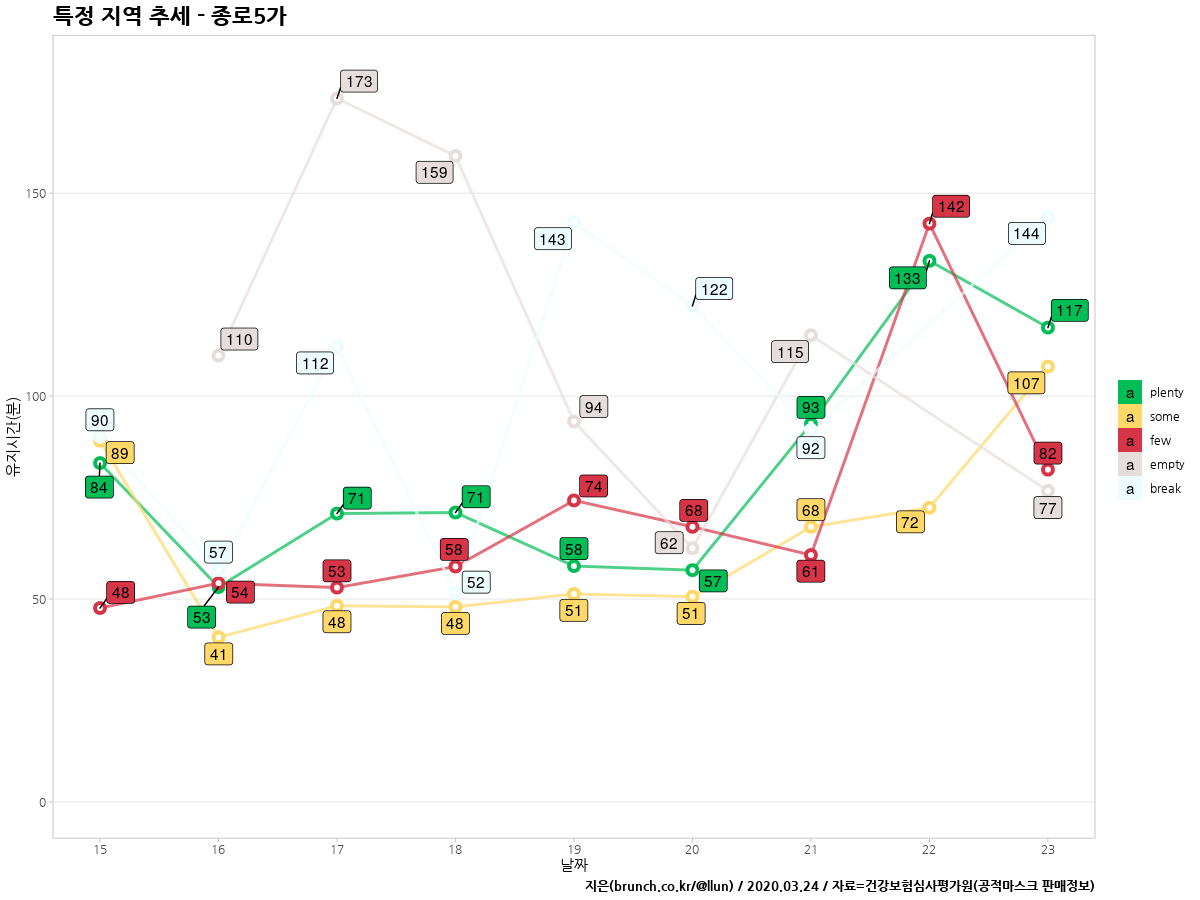 이정도로 꿰기 작업을 마치고, 데이터가 좀 더 모이면 각 지역별, 일자별, 요일별 추세를 반영하여 며칠 뒤(본인이 구입 가능한 요일)의 상태 변화 시각을 예측해볼 수 있을 듯싶습니다.