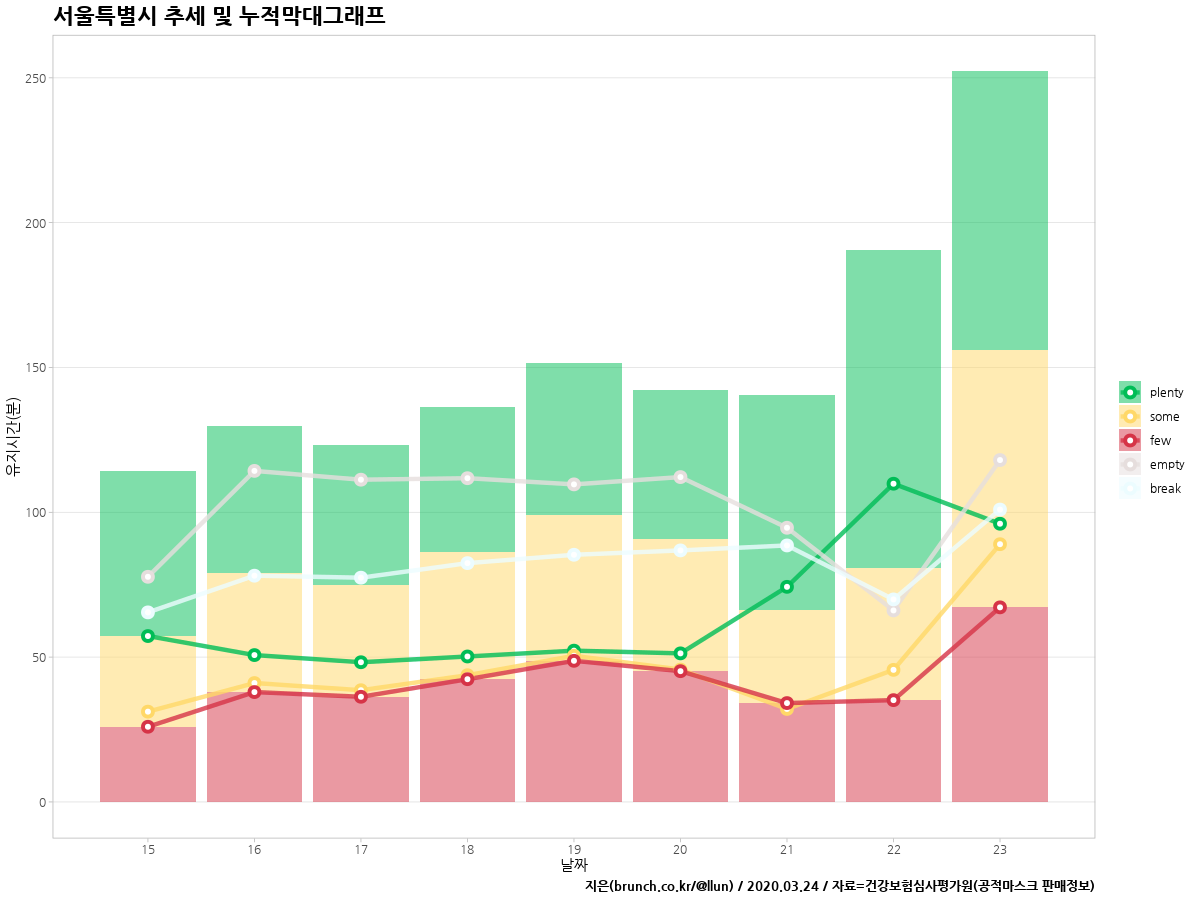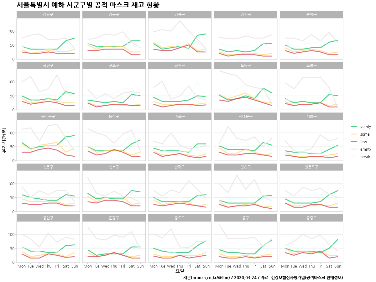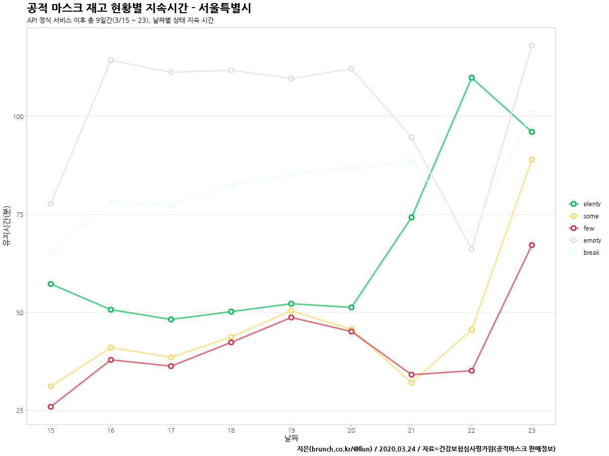 • 우선 서울 시내로 한정하여 요일별로 구분하고 마스크 재고의 각 상태가 지속되는 시간을 흩뿌려 놓았습니다.