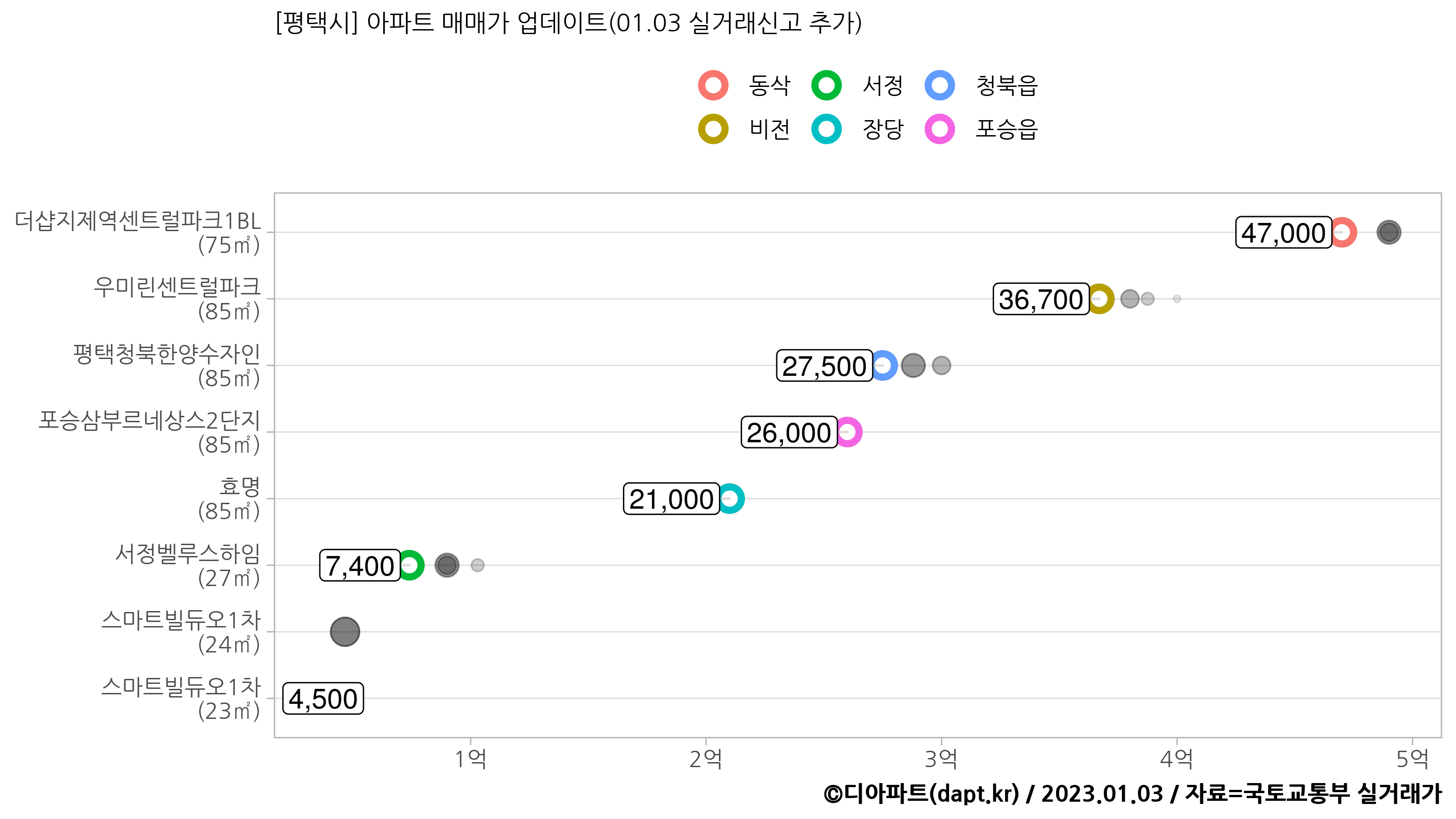 색깔로 ③지역(읍면동)을 구분했고 검정색 반투명 원으로 ④이전 거래금액을 함께 나타냈습니다.