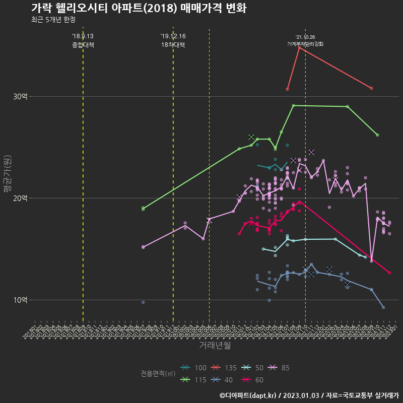 이 단지가 조금 가격이 오르다가 꽤 떨어졌다가 다시 이전 금액에 근접한 금액으로 거래된 모습이죠.