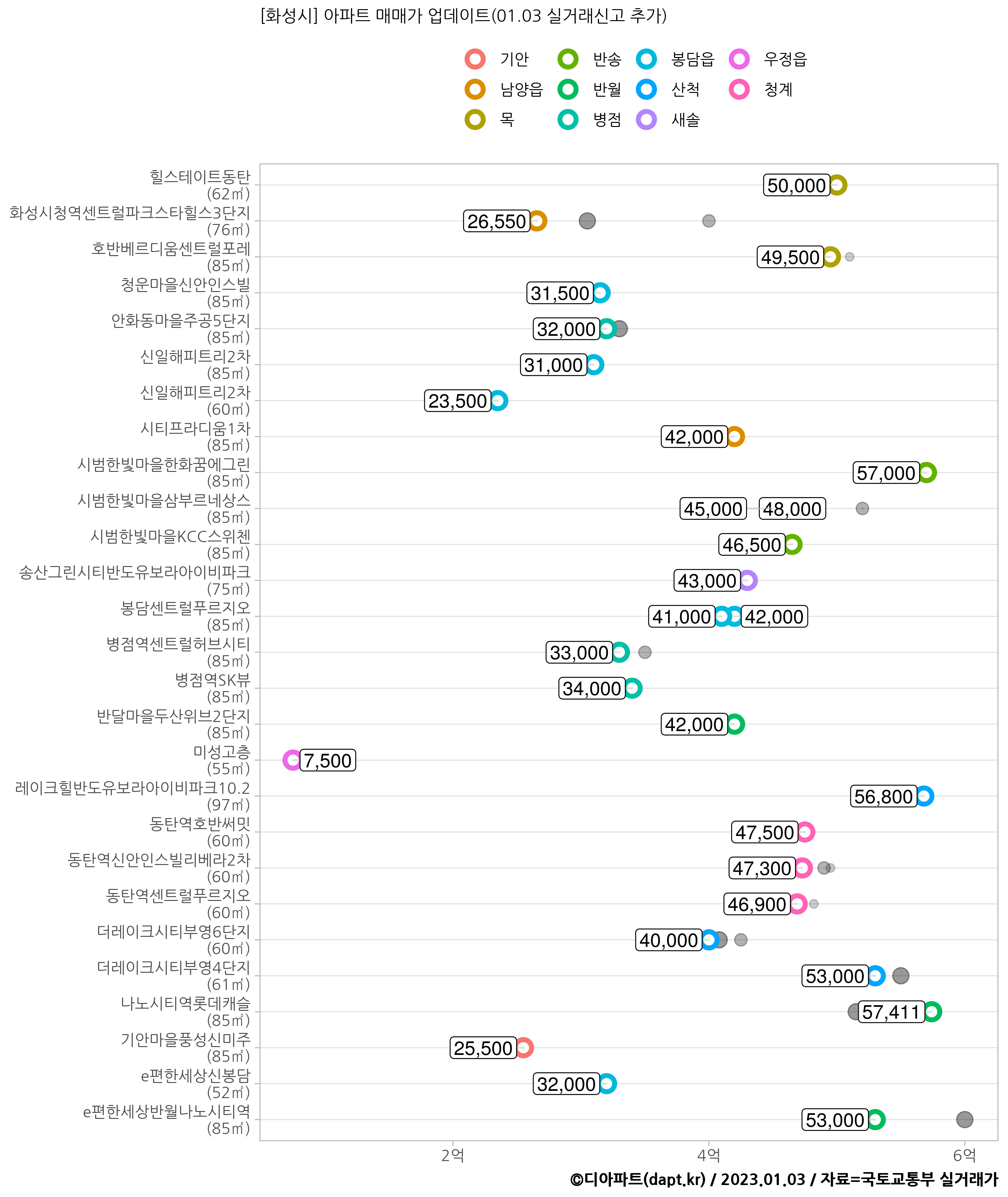 첫줄도 그렇지만 2.3번 줄의 우미린과 한양수자인처럼 작고 옅은 원이 최근 실거래가의 우측(더 높은 금액)에 위치하면서 점차 왼쪽으로 커지는 모습인데요,