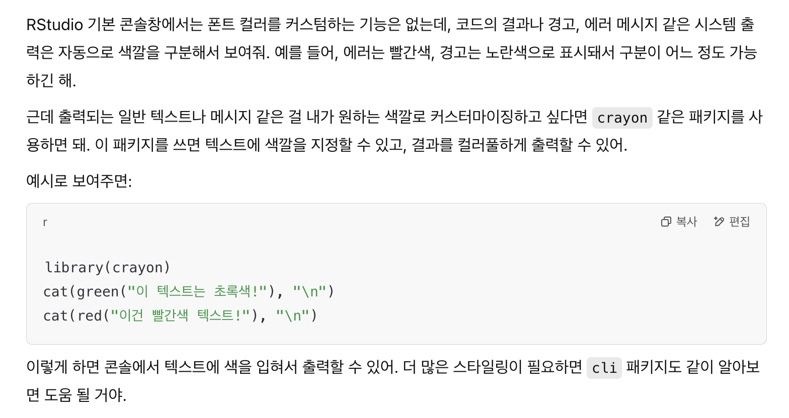 RStudio 기본 콘솔창에서는 폰트 컬러를 커스텀하는 기능은 없는데, 코드의 결과나 경고, 에러 메시지 같은 시스템 출력은 자동으로 색깔을 구분해서 보여줘. 예를 들어, 에러는 빨간색, 경고는 노란색으로 표시돼서 구분이 어느 정도 가능하긴 해.